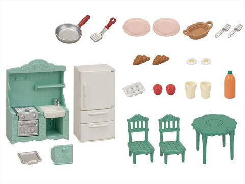 キッチンで料理をする、ダイニングテーブルで食事をするなど、このセットだけでダイニングルームでの楽しい遊びが出来ます。