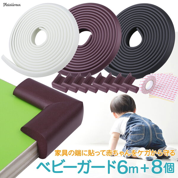 品質の高さを保証済です> 【商品仕様】 ○取付方法 1.貼り付ける場所の長さにカットします 2.内側に両面テープを貼ります 3.両面テープのはく離紙をはがします 4.端からおさえながら貼り付けます ○カラー:ホワイト、ブラウン、ブラック ○サイズ:ベビーガード6m、コーナー8個、両面テープ(ロール1個、シート2枚) コーナー クッション: 6m×2.3cm×0.8cm コーナーガード: 5.5cm×2.3cm×0.8cm ○素材:NBR ○ブランド:Plaisiureux(プレジュール) メーカー希望小売価格はメーカーサイトに基づいて掲載しています【ベビーガード6m&コーナー8個セット】 つかまり立ちやヨチヨチ歩きをはじめた赤ちゃんは、家具の端で頭や顔をぶつける危険が高く、大ケガにつながる心配があります。