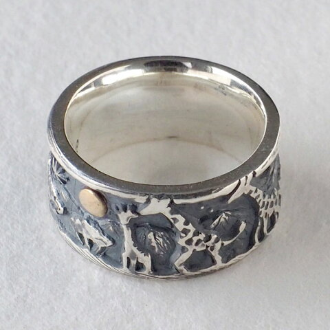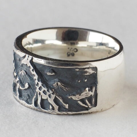 キリンの親子 夜の静かな草原 真上から見た様子 存在感たっぷり 着用(女性・8号) 着用(男性・18号) 夜の草原をゆったりと歩くキリンたちがデザインされた、本当にある実際の風景を切り取ったかのような、生き生きとした自然と壮大さを感じるリング。